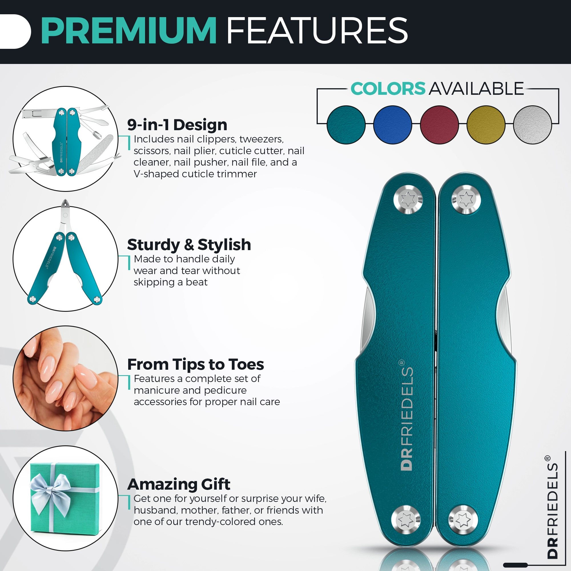 Elevate your nail care with the DRFRIEDELS 9-in-1 Professional Manicure & Pedicure Multi-Tool. This compact, foldable tool combines nine essential instruments, including a nail cutter, pliers, tweezers, cuticle scissors, and more, all crafted from durable stainless steel. Designed for both men and women, its sleek design ensures portability, making it perfect for home use or travel. Engineered with German precision, this kit reflects our commitment to excellence and innovation, providing a reliable solution for all your nail care needs.